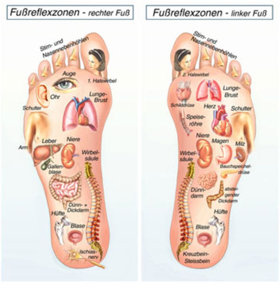 Zunächst können die Fußrücken und dann die Sohlen berührt und gestrichen werden. Danach werden die einzelnen Energiepunket an den Füßen stimuliert.